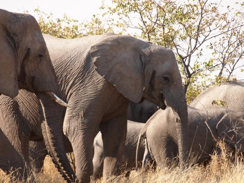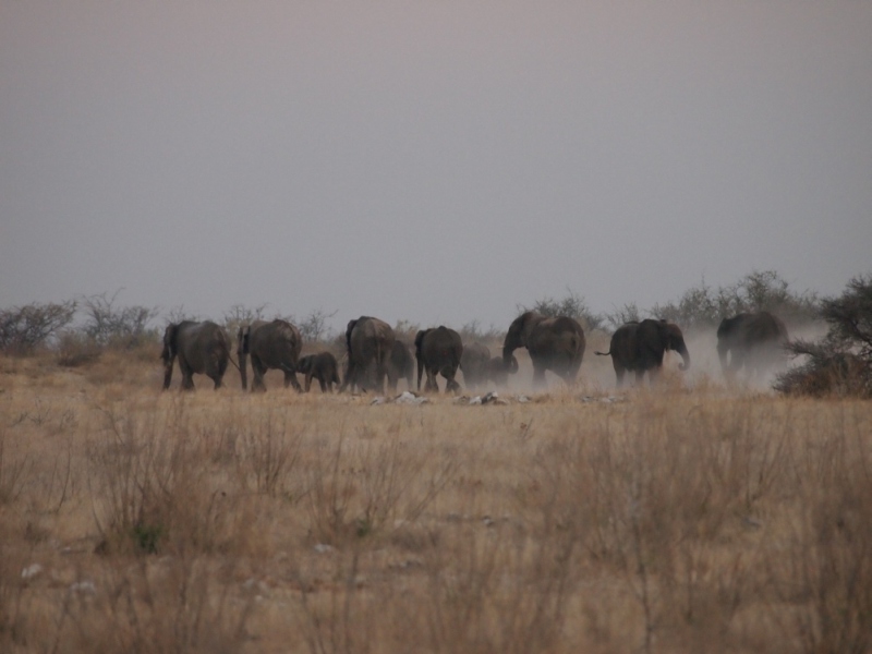 Bevor die Tore geschlossen wurden erreichten wir das Restcamp. Beim Aufstellen der Zelte gab es plötzlich Aufregung. Eine Elefantenherde soll draußen vorbei ziehen. Wir liefen zum Zaun und beobachteten sie bei Ihrem Vorbeimarsch.