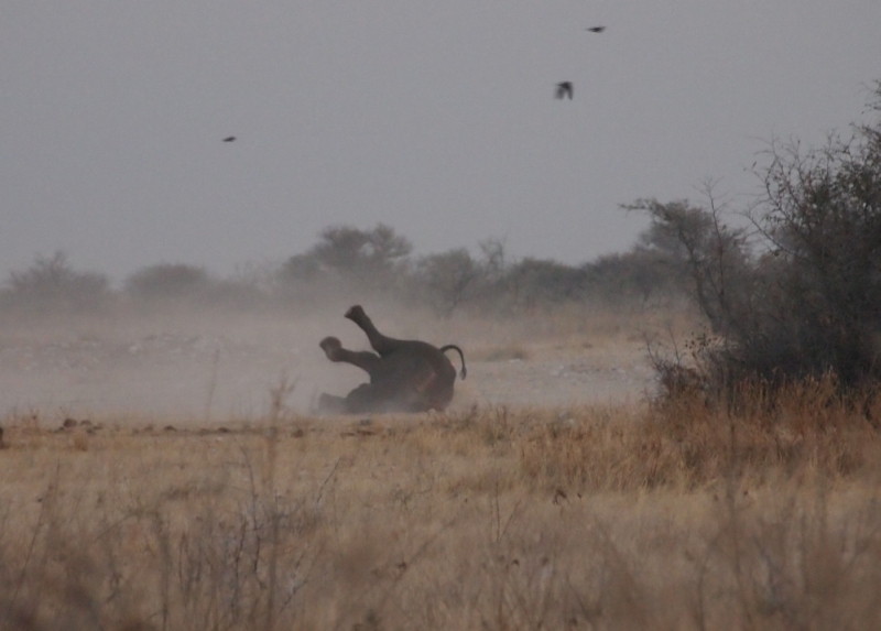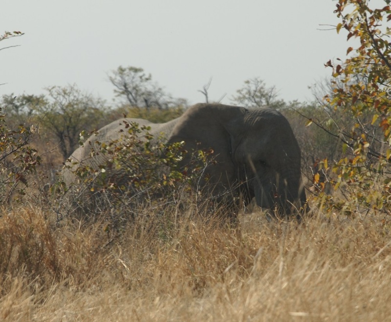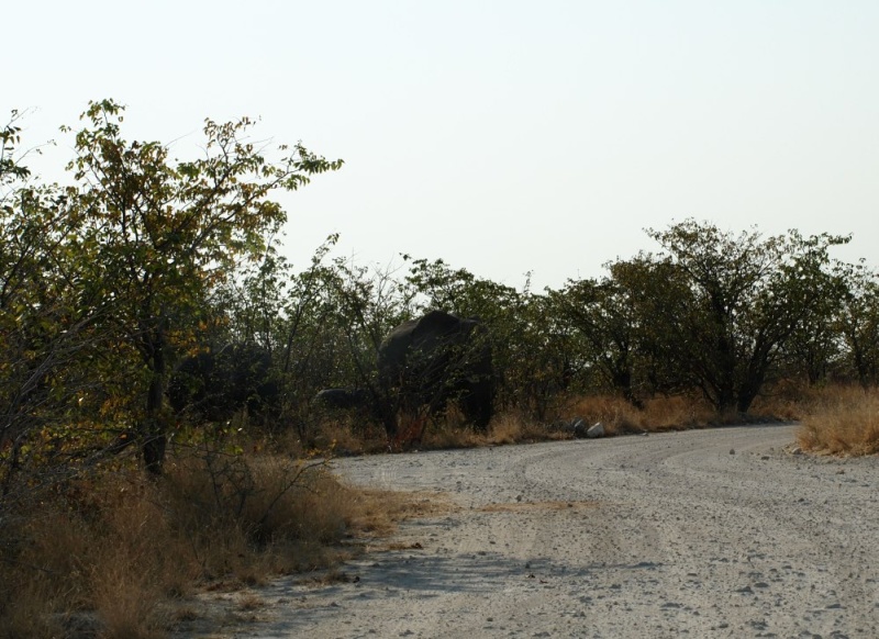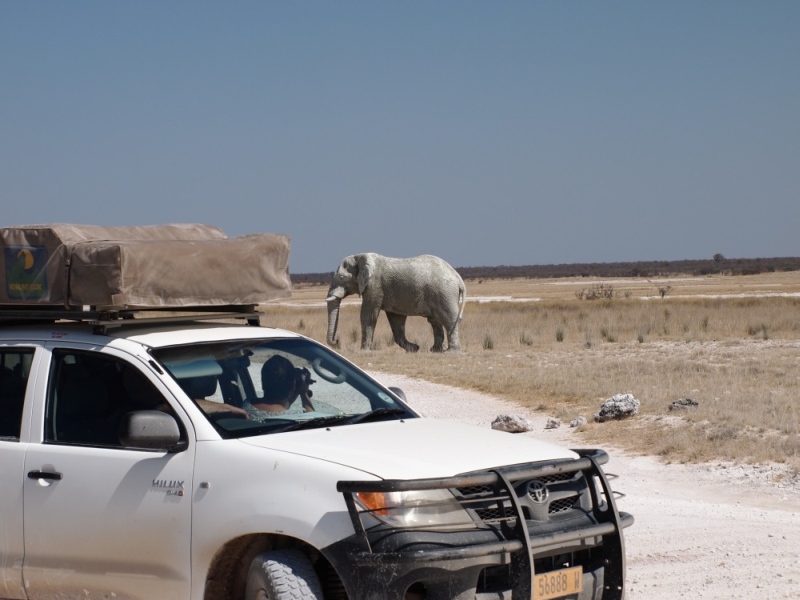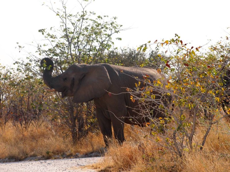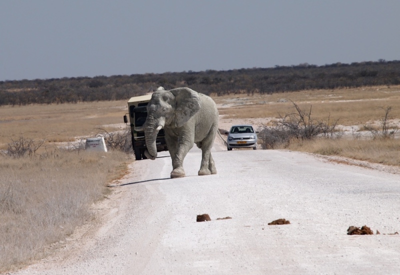 Unser erster Elefant. Wir hielten an um ihn zu beobachten. Nach einiger Zeit hatte er genug und verschwand. Wir wollten gerade, noch immer hellauf begeistert von unserer Sichtung, auf die Straße fahren als ein Auto vor uns abrupt stoppte. Ein mächtiger Elefant kam aus dem Gebüsch und ging vor dem Auto über die Straße Richtung Wasserloch.