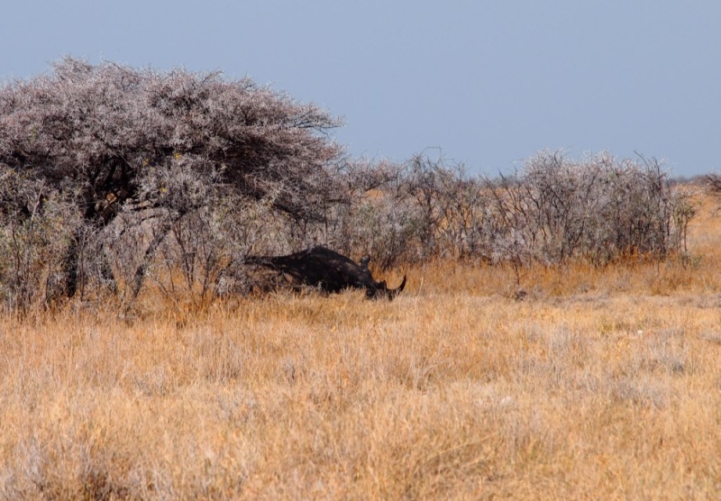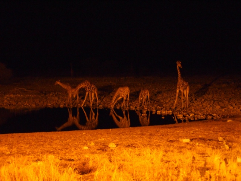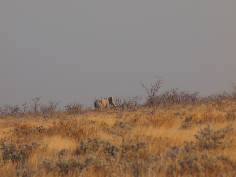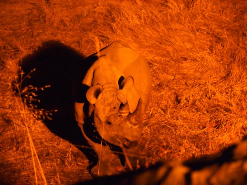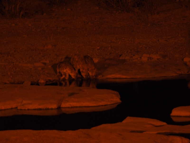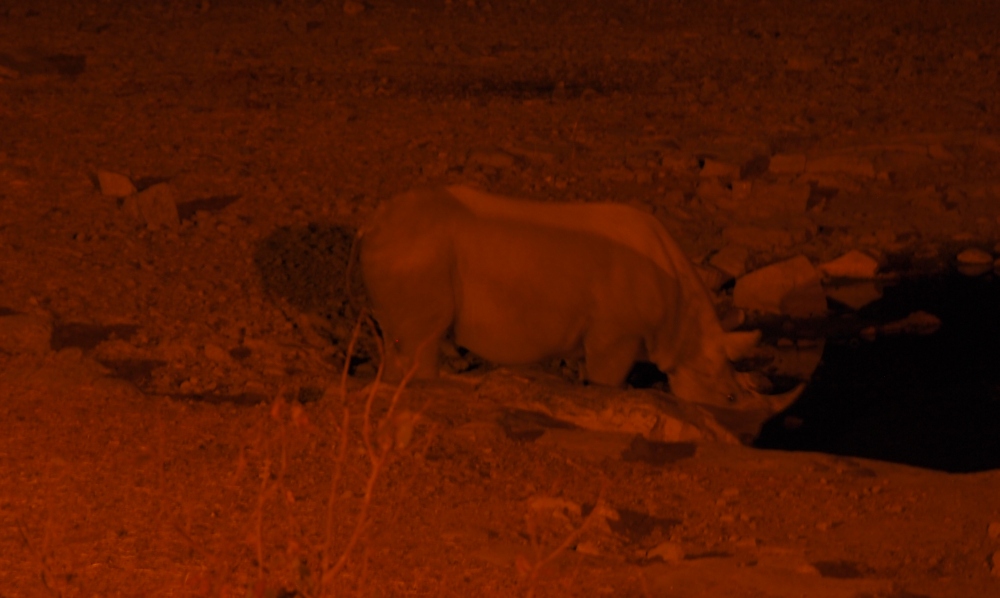 Aus der Richtung, in die die Löwen mit den Giraffen verschwunden waren, kam zeitgleich zum dritten Akt, ein Nashorn völlig lautlos aus der Dunkelheit zum Wasserloch. Es blieb nicht lange und verschwand bald wieder. Nun war das Loch leer und wir gingen, den Kopf voller abenteuerlicher Bilder, zu Bett.