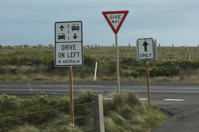 Erinnerung an den Linksverkehr an der Great Ocean Road