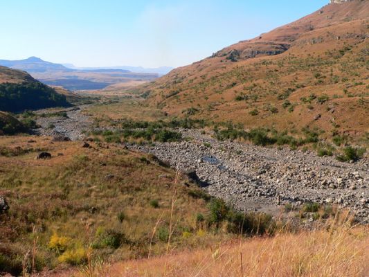 Ab und zu wehte ein würziger Duft um unsere Nasen und bei einer günstigen Gelegenheit wurden die Hosen gekürzt. Bald kamen wir in die Nähe des Tugela River, aber nur kurz, dann ging es in diversen Kehren langsam aber stetig bergauf. Zwei kleine Wäldchen sorgten zwischendurch für Abkühlung. Wir sahen einheimische Frauen, die Gräser schnitten, vermutlich um daraus Körbe oder ähnliches herzustellen. Sie hatten Glück, ihr „Arbeitsplatz“ lag im Schatten.
