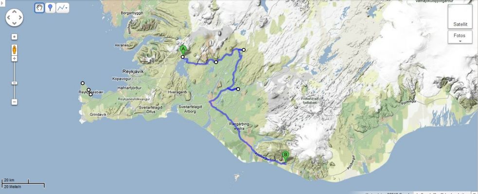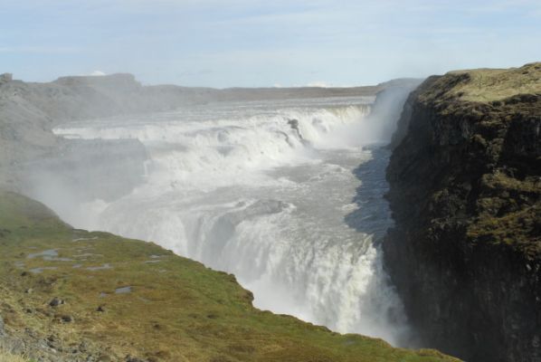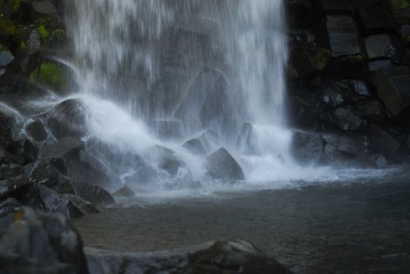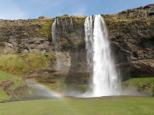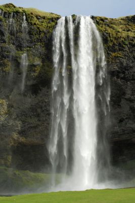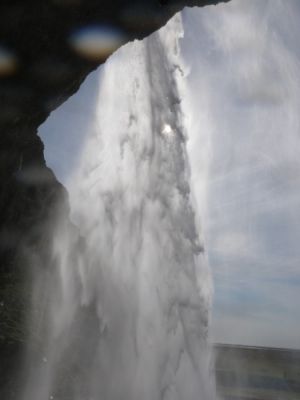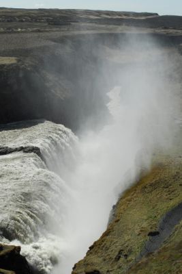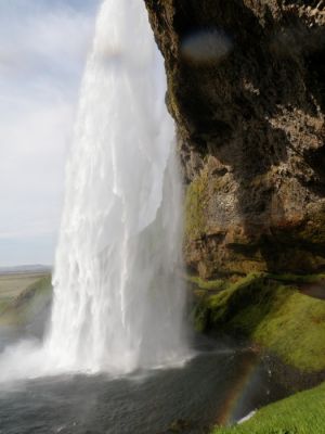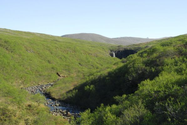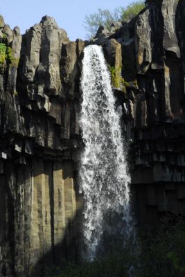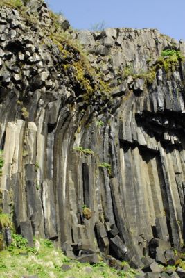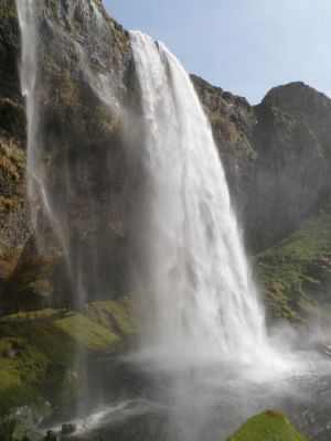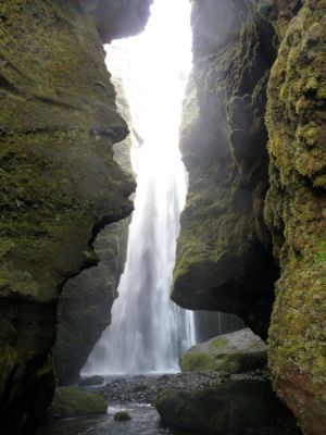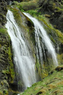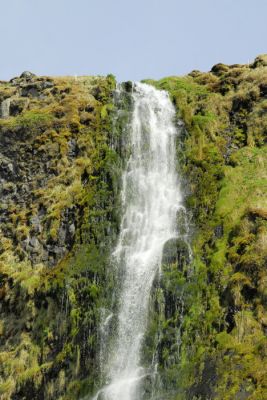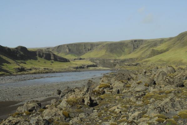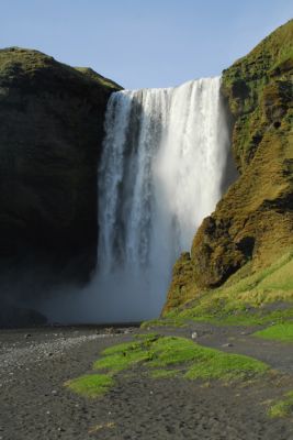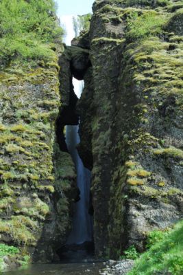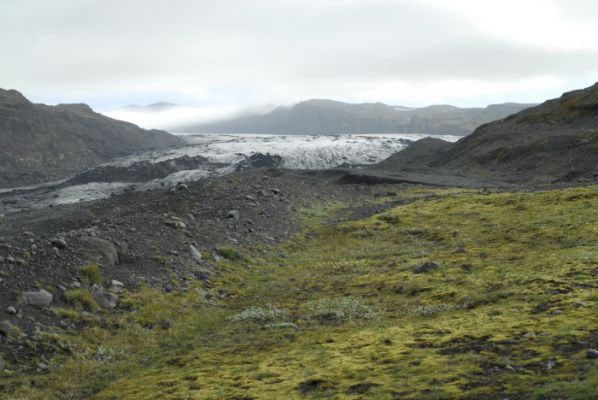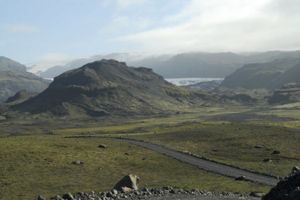 Vorbei an dunklen Felswänden, die von hellem Grün überzogen sind sehen wir viele Wasserfälle und Schluchten. Dann ist eine Gletscherzunge zu sehen und wir wollen näher hin, also die nächste Schotterpiste zum Skolheimajökull. Unser kleiner Polo meistert seine erste "Dirt Road" bravourös.