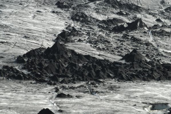 Das Schmelzwasser hinterlässt skurrile kleine "Häufchen" der Asche.
