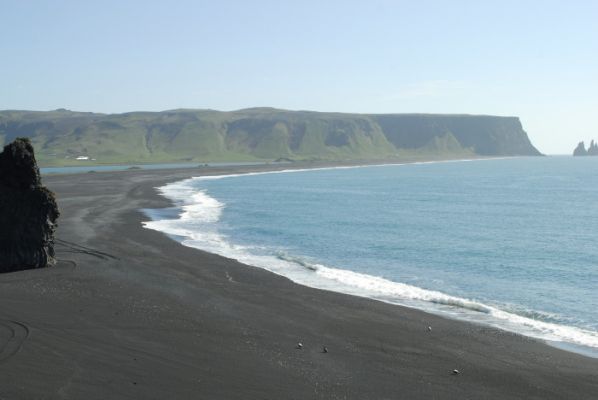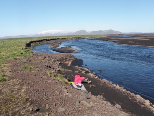 In Vik ein kurzer Einkauf - unser Keksvorrat war schon zuende! Bald danach Mittagspause an einem Fluss mit schwarzem Lava-Asche-Strand und Gletscher im Hintergrund.