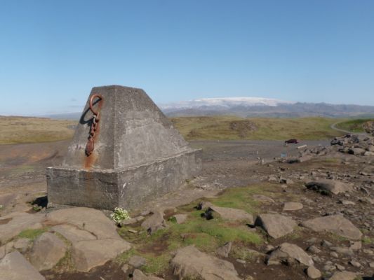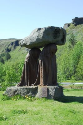 Weiter geht's nach Kirkjubaejarklaustur. Das Denkmal der beiden Nonnen mit dem Stein bewundert...