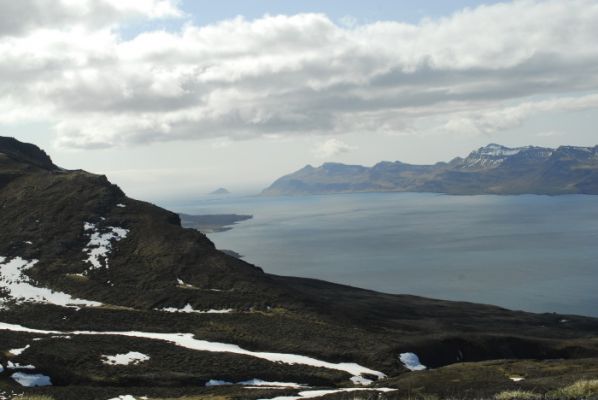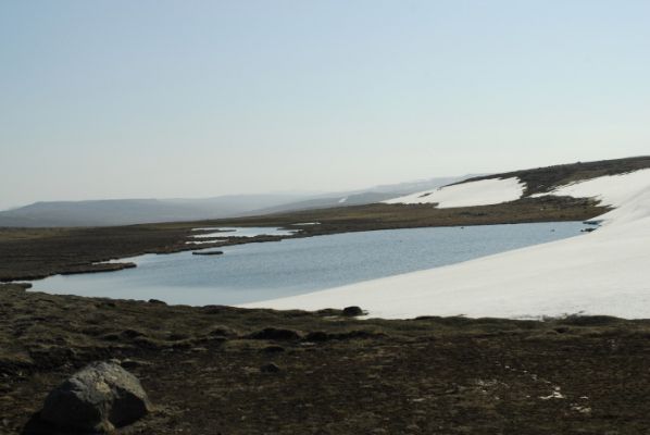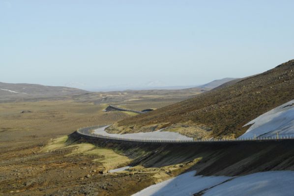 Immer wieder verlassen wir das Meer und fahren über Pässe mit herrlichem Ausblick auf die rot-grau-braune Landschaft, durchzogen von Wassertümpeln und Schneeresten.