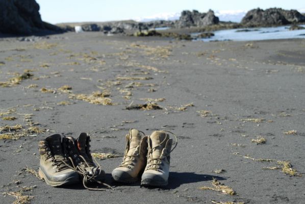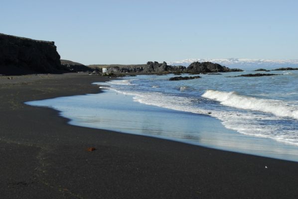 Barfuß spazieren wir den Strand entlang. Im Gegensatz zu gestern liegt hier fast kein Treibholz und Algen. Das Farbenspiel ist herrlich, schwarzer Strand, blaues Meer und das Weiß der sich brechenden Wellen.