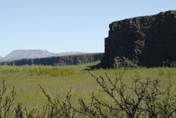 Wir fahren zuerst in die Schlucht rein und spazieren zum Ende, an dem ein kleiner See im Schatten der Felswand liegt. Für Island selten dürfen wir auch durch einen kleinen "Miniwald" spazieren.