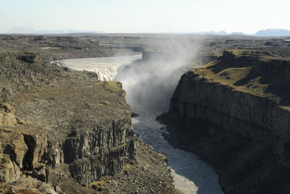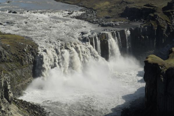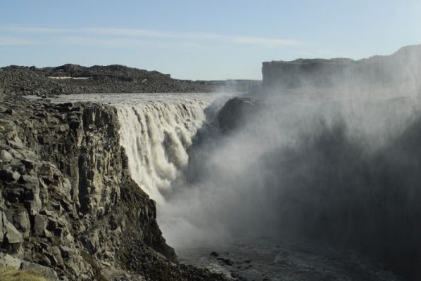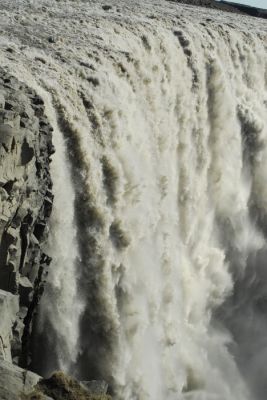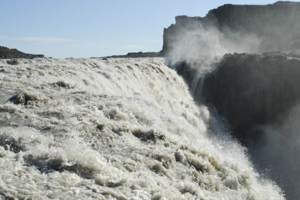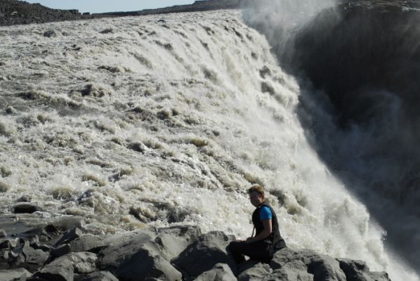 Am Dettifosss angekommen wandern wir vor bis zur Kante. Direkt neben uns rauscht das Wasser in die Tiefe. Unten kann man schemenhaft erkennen, wie es von den Steinen wuchtig abprallt und in großen, stetigen Gischtfontänen zerstäubt. Der Wind steht günstig und wir bleiben direkt neben dem Wasserfall trocken, während die Westseite mit leichten Regen „geduscht“ wird.