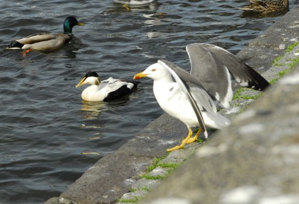 Hier erwische ich endlich eine männl. Eiderente (die schwarz-weiße), die uns auf der ganzen Tour begleitet haben, aber viel zu kamerascheu waren.