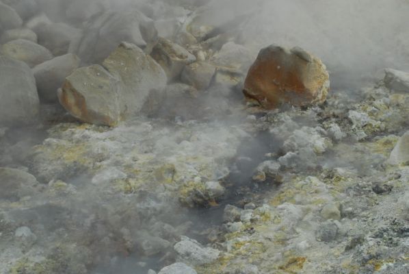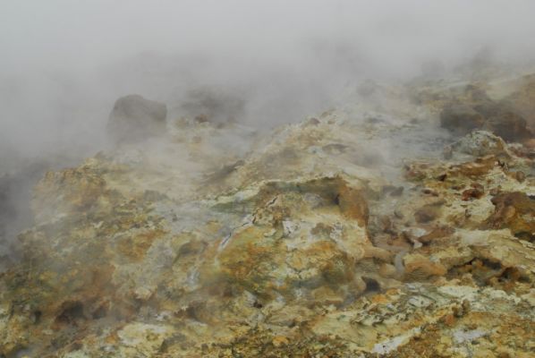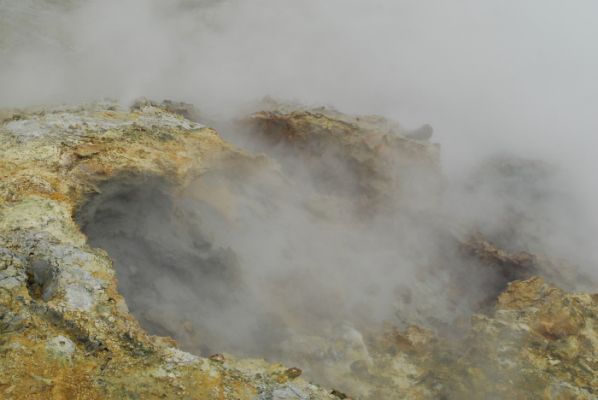 Wir stromern rum und finden natürlich einen Weg der berghoch geht - genau auf eine dicke, fauchende Dampfwolke zu. Am "Kraterrand" sehen wir dann, dass uns kein brodelnder Vulkanschlund mit glühender Lava erwartet, sondern viele kleine Dampfquellen. Je nach Windrichtung kommen wir gut ran.