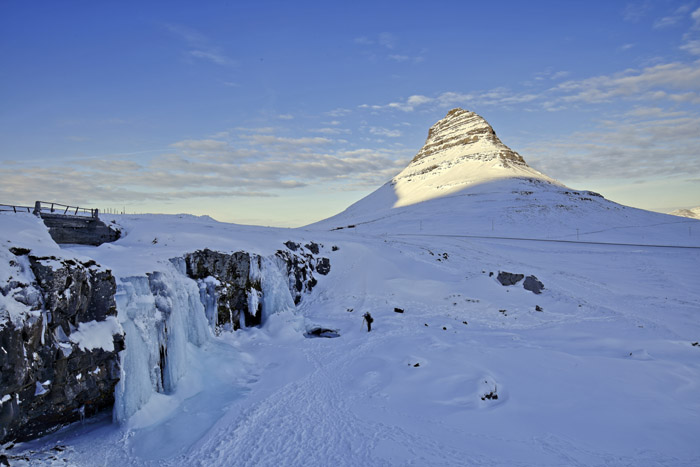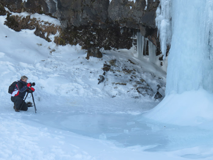 Gegen 14:45 Uhr erreichen wir Grundarfjördur und den Wasserfall am Kirkjufell. Hier wollen wir heute Abend auf das Polarlicht warten, möchten jetzt aber schon mal einen Blick auf die Gegebenheiten werfen. Da der Wasserfall nach Norden ausgerichtet ist, erhält er im Winter kein direktes Sonnenlicht, doch die späte Nachmittagssonne scheint auf den Kirkjufell im Hintergrund. Wir sind ziemlich erstaunt, als wir Leute direkt am Wasserfall sehen, also dort, wo sonst das Wasser ist. Der ganze Wasserfall ist komplett eingefroren und nur hinter dem Eis kann man das Wasser hören und sehen. Die gesamte Wasserfläche am Fuße der Wasserfälle ist begehbar. Dieses Wunderwerk müssen wir natürlich genau betrachten.