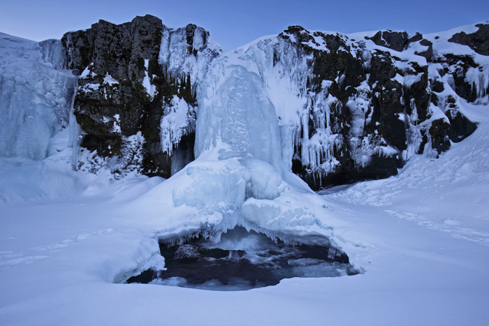 Auch um den Hraunfossar liegt mehr Schnee als gewöhnlich und bildet einen scharfen Kontrast zur dunklen Lava und dem hellblauen Wasser des Flusses. Wir schauen uns alles an und wollen dann zum Hotel fahren, um später hierher zurückzukehren. Es ist zwar Bewölkung für den größten Teil der Nacht angesagt aber gegen 19 Uhr scheint es noch ein paar Wolkenlücken zu geben.