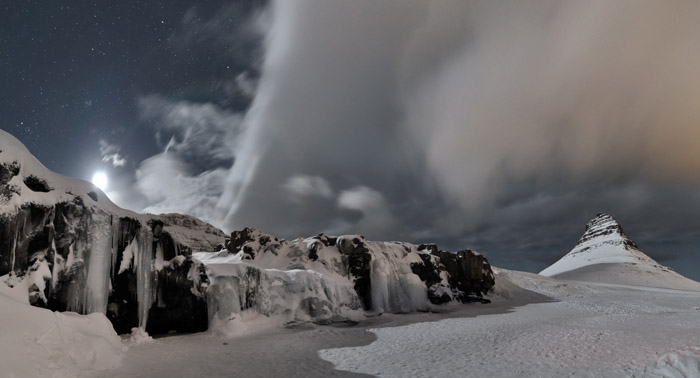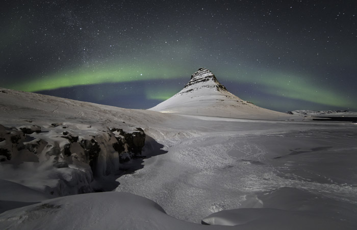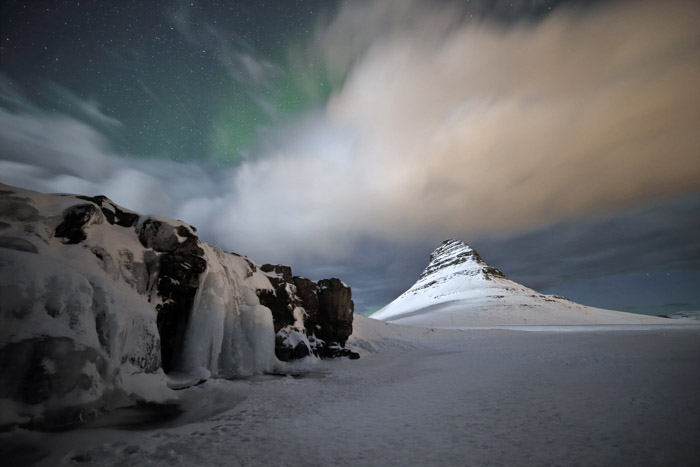 Um 20 Uhr machen wir uns dann wieder auf den Weg. Es wird heute Abend ein Wettlauf zwischen den hereinziehenden Schlechtwetterwolken und dem angekündigten Polarlicht, deswegen wollen wir die verbleibenden klaren Stunden noch gut nutzen. Auf der Fahrt zum Wasserfall merken wir, dass der Wind bereits sehr aufgefrischt hat und den Schnee quer über die Straße treibt. Das sieht unangenehm aus. Wir ziehen alles an, was wir haben und stampfen vom Parkplatz zum Wasserfall. Dort angekommen, hat der Wind bereits alle Spuren des Tages verweht und der Aufstieg an der Seite der Wasserfälle führt durch wadentiefen Schnee. Sigrid kehrt um und will die Lichter aus dem Auto heraus beobachten. Sandra stellt sich in Position und wartet auf die große Show am Himmel. Zuerst passiert nichts. Der Halbmond wirft sein helles Licht auf die verschneite Landschaft, die Sterne funkeln und von hinten fegt der Wind den Schnee über die Ebene. Manchmal ist es schwer, nicht den Halt zu verlieren und das Stativ muss festgehalten werden. Zum Glück hält die Kleidung all dies ab und Sandra friert nicht. Dann tauchen die ersten Lichter auf, erst schwach, dann etwas stärker. Sie bilden Bögen über dem Kirkjufell, doch die versprochene große Show ist es noch nicht.