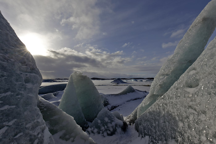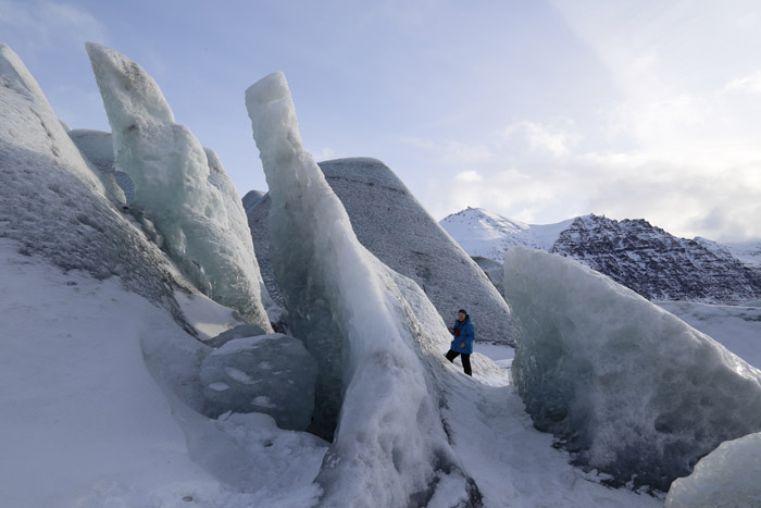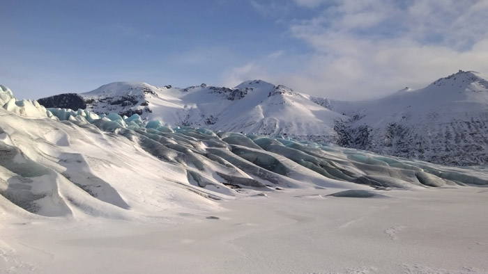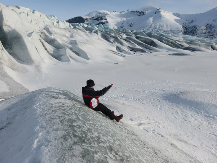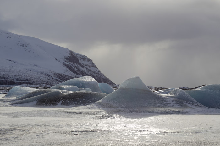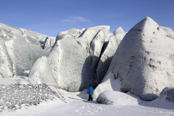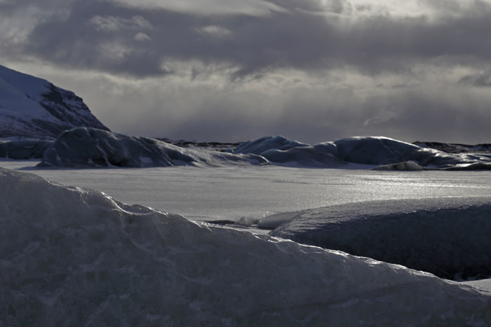 Die wenigen Wanderer vor uns sehen winzig klein aus vor der Gletscherfront. Wir kommen immer dichter und kommen uns bald vor wie auf einem Spielplatz der Riesen. Der See vor der Gletscherzunge ist solide zugefroren, darin befinden sich große blau glänzende Eisbrocken. Überall sind Spuren von Besuchern vor uns zu sehen, die uns zeigen, dass man sich hier gefahrlos bewegen kann. So erkunden wir die Gletscherzunge immer weiter, finden Löcher in Eisbergen, Rutschen und dann kommt sogar noch die Sonne heraus.