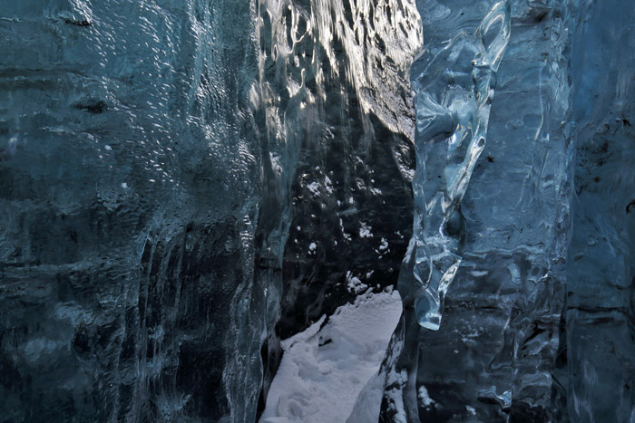 Auch ein paar Spalten im Eis erkunden wir. Dunkelblau erheben sich die glatten Eiswände an beiden Seiten. Nur dort, wo bereits Fußspuren zu sehen sind, erkunden auch wir etwas das Innenleben des Gletschers, so eine Chance bekommt man wohl nicht allzu oft. Allzu weit gehen wir natürlich nicht herein, zu groß ist der Respekt. Doch hier können wir nun wirklich einmal alleine die beeindruckende Kulisse eines Gletschers genießen und im Nachhinein sind wir uns beide einig, dass das hier viel schöner war als der Besuch in der Eishöhle.