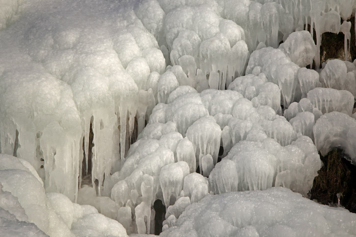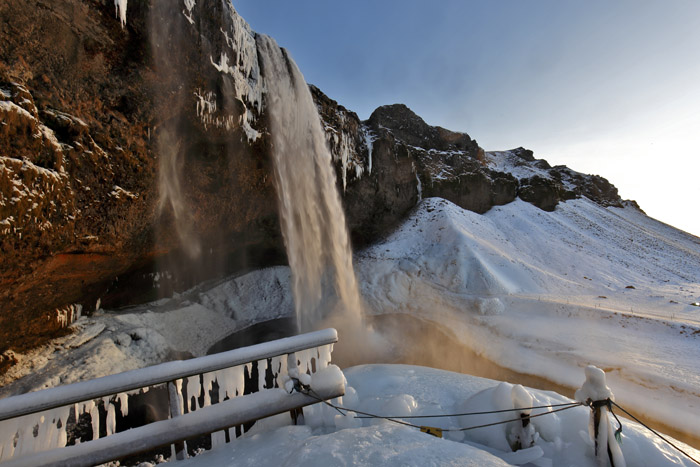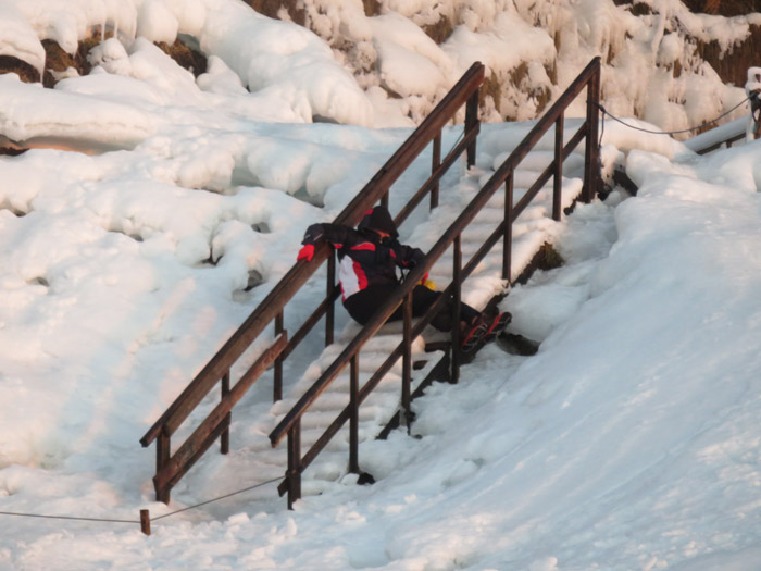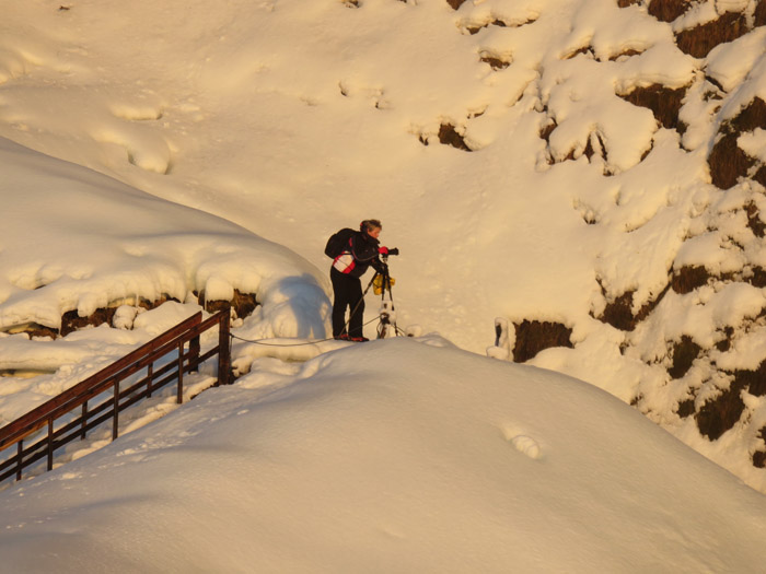 Der Weg, auf dem man normalerweise hinter dem Wasserfall entlang gehen kann ist dick vereist. Erst denken wir, er ist gesperrt, da wir niemanden dort gehen sehen aber dann wagen es doch ein paar Mutige. Besonders die bis zur Unkenntlichkeit vereiste Treppe bereitet ihnen Probleme. Hoch kommen sie ja alle noch aber das Herunter bereitet dann umso größere Schwierigkeiten, zumal einige sogar ohne Spikes unterwegs sind. Das sieht alles nicht so einfach aus und doch hat sich Sandra für den Sonnenuntergang einen Platz ausgesucht, zu dem auch so eine dick vereiste Treppe bezwungen werden muss. Als dann 50 Minuten vor Sonnenuntergang die Sonne tatsächlich ihr Licht auf den Wasserfall wirft, geht sie los. Hinauf ist es dank der Spikes auch gar nicht so schlimm. Nun steht sie oben auf einem komplett vereisten Hügel mit einem schönen Blick auf den Wasserfall und den Sonnenuntergang. Der Holzsteg und das Geländer sind ebenfalls bizarr vereist. Zum Glück ist die Gischt vom Wasserfall hier gar nicht so stark wie erwartet, so dass man ganz gut fotografieren kann, ohne ständig die Linse putzen zu müssen.