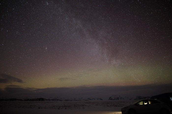 So fahren wir bis weit hinter Vik, wo wir endlich einen Parkplatz unter dem sternenklaren Himmel finden. Nun muss ja „nur noch“ das Polarlicht kommen. Das zeigt sich heute Abend jedoch mal wieder von seiner trägen Seite. In nördlicher Richtung ist zwar ein schwacher grüner Bogen zu sehen aber weiter passiert nichts. Stattdessen bewundern wir den Sternenhimmel und die Geschwindigkeit, mit der sich die Wolken von Westen her nähern. Nach nur einer Stunde stehen wir wieder im Dunklen, doch wir haben es zumindest versucht. Mit diesem guten Gefühl fahren wir nun zurück zu unserer Lodge und freuen uns über die Erlebnisse des Tages.