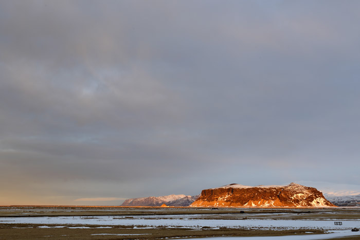 Unsere vorletzte Nacht im winterlichen Island beenden wir ohne Stress mit einem schönen Frühstück in der Farmhouse Lodge. Dafür opfern wir aufgrund der späten Frühstückszeiten heute den Sonnenaufgang und starten in Ruhe in den Tag. Da der Himmel bedeckt ist und nur ein schmaler Streifen blau zu sehen ist, sind wir mit unserer Entscheidung ganz zufrieden. Nach einer herzlichen Verabschiedung von der portugiesischen Gastgeberin versuchen wir heute noch einmal, die Gletscherzunge des Sólheimajökull zu erreichen. Diese hatten wir ja in der letzten Woche wegen einer falsch gewählten Zufahrt nicht gefunden aber mittlerweile kennen wir den richtigen Weg.
