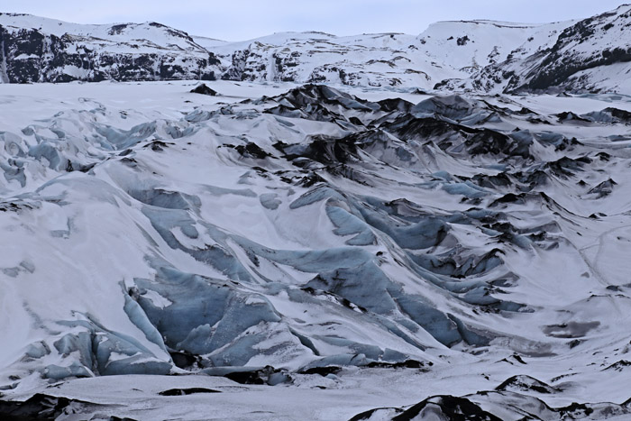 Auf einer guten und asphaltierten Straße erreichen wir nach einigen Kilometern einen großen leeren Parkplatz. Wir sind wohl heute die ersten Besucher hier. Da sich wie überall die Gletscher auch hier auf dem Rückzug befinden, müssen wir erst einmal wandern, bevor das Eis in Sichtweite kommt. Und wieder einmal sind wir sehr froh, Spikes unter den Schuhen zu haben, so ist die Annäherung kein Problem. Wahrscheinlich bedingt durch den Ausbruch des Eyjafjallajökull im Jahre 2010 ist der Gletscher sehr mit Asche bedeckt. Ganz im Gegensatz zu unseren bisherigen Gletschererlebnissen dominieren hier nicht weiß und blau sondern schwarz, grau und ein bisschen blau. Das ist gewöhnungsbedürftig und wirkt irgendwie recht trist, zumal auch die Sonne nicht scheint. Auch die Gletscherfront ist lange nicht so schön wie der Skaftafjelljökull. Wir sind schon ganz schön verwöhnt.