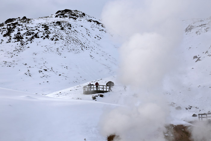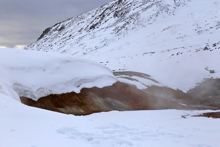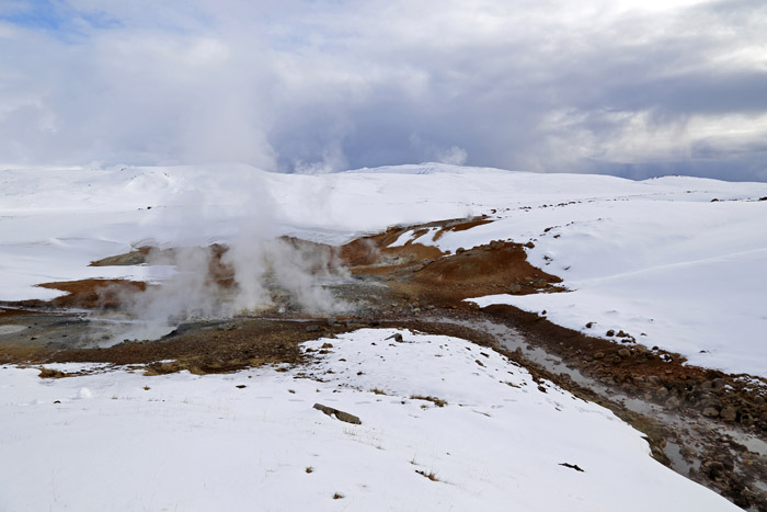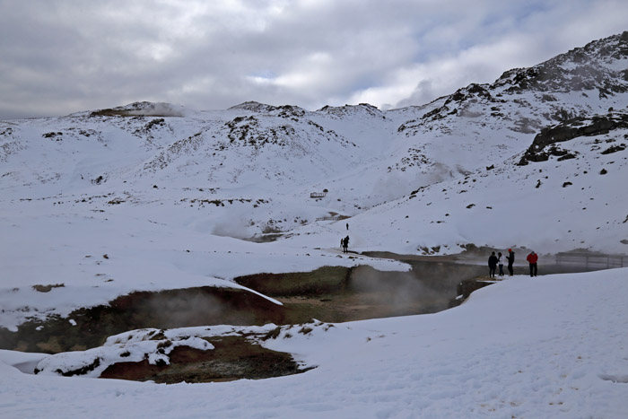 Zurück am Auto kochen wir mit unserem Wasserkocher noch einen Kaffee und schauen den ziehenden Wolken zu. Unser nächstes Ziel heißt Krisuvik, ein kleines, recht farbenfrohes Thermalgebiet zwischen den Städten Grindavík und Hafnarfjörður. Mittlerweile ist es recht hell geworden am Himmel und ab und zu schaut sogar die Sonne heraus. Während die Nase in Krisuvik doch etwas strapaziert wird, haben die Augen einiges zum Anschauen. Brodelnde Blubberquellen, gelbe und rote Erdhügel und dazwischen überall jede Menge Schnee und viele Besucher.