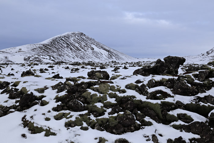 Trotzdem schauen wir uns natürlich alles genau an. Zurück am Parkplatz, erwacht dort gerade das touristische Leben. Viele Touristen machen sich jetzt auf den Weg, doch unsere Fahrt führt weiter in Richtung Flughafen. Dabei wird die Umgebung wieder winterlicher und der graubraune Untergrund weicht einer durchgehenden Schneedecke. In Selfoss verlassen wir die Ringstraße und folgen einer Nebenstraße zur südlichen Reykjanes Halbinsel. Während uns in den letzten Tagen großartige Berg- und Gletscherpanoramen begleitet haben, wechselt die Landschaft hier zu einem Anblick, den viele als „typisch Island“ bezeichnen würden. Es ist ein Mix aus bedeckten Farben, schwarze Lavasteine, grünes Moos und weißer Schnee soweit man schauen kann. Es ist anders aber trotzdem ziemlich reizvoll.