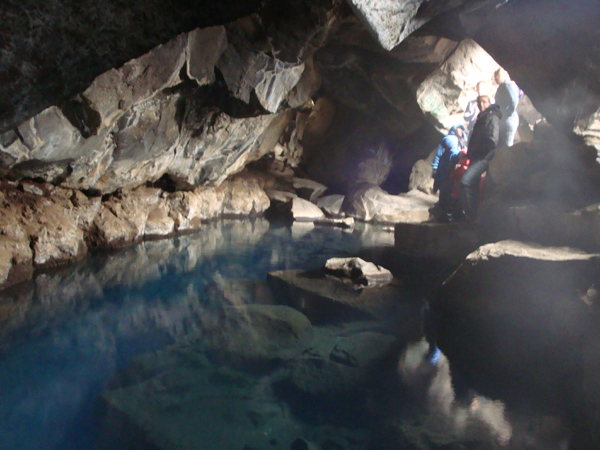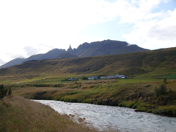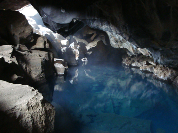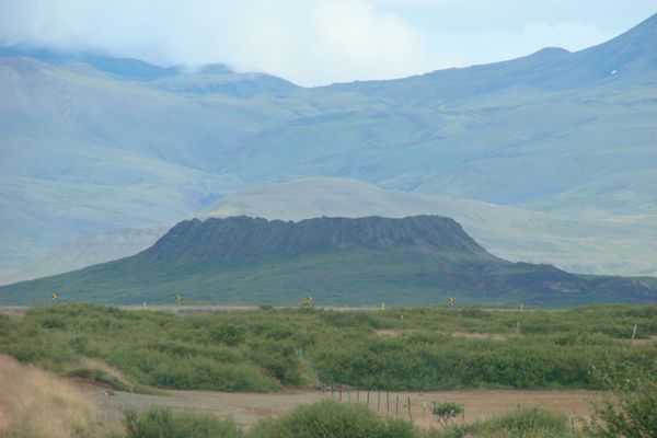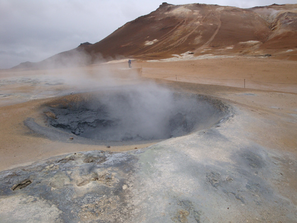 Tatsächlich gibt es ein schönes Becken. Im Hintergrund die unvermeidlichen Gewächshäuser. Bevor wir nach Reykjahlid kamen, hatten wir einen schönen Ausblick auf den Hverfjall, der durch eine gigantische Gasblasenexplosion entstanden ist.