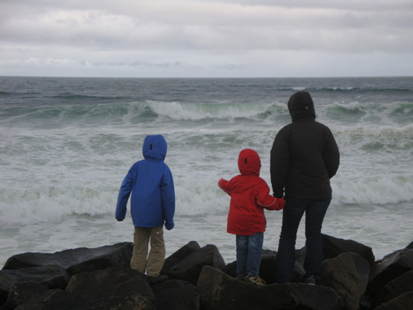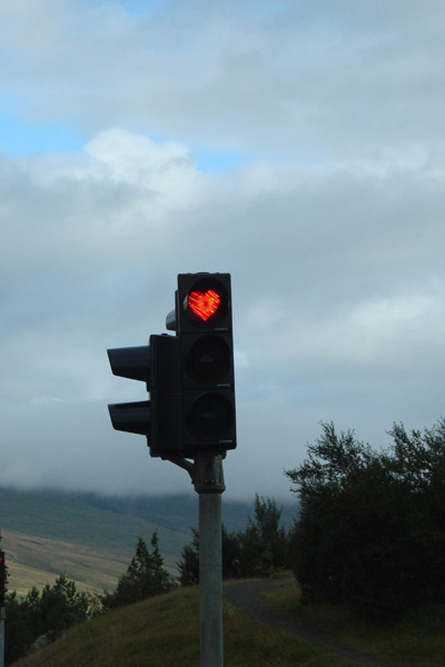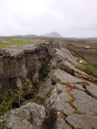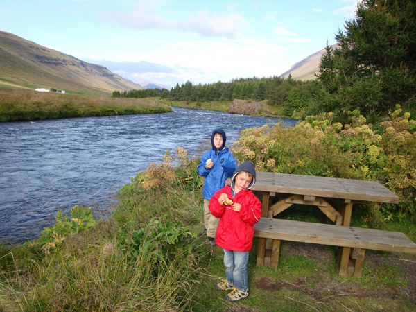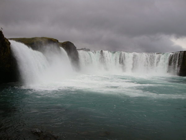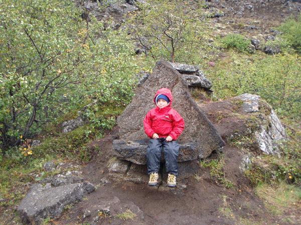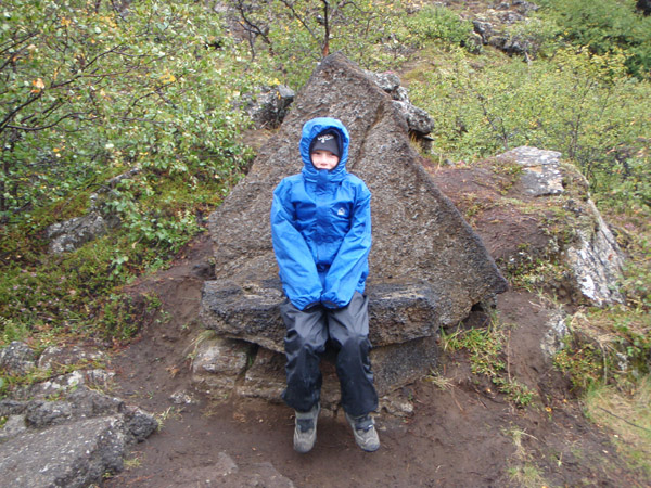 Auf der anderen Seite stehen die Leute direkt am Abgrund. Wenn man lange ins fallende Wasser schaut hat das hier eine hypnotisierende Wirkung. Nach ca. einer Stunde gehen wir, nass von Regen und Gischt, zurück zum Parkplatz. Einen kleinen Abstecher machten wir, sehr zum Unmut der Kinder, noch zum Selfoss.