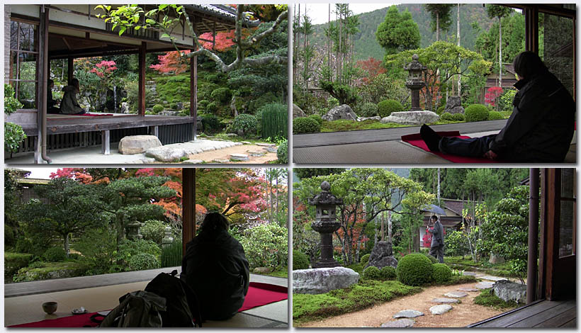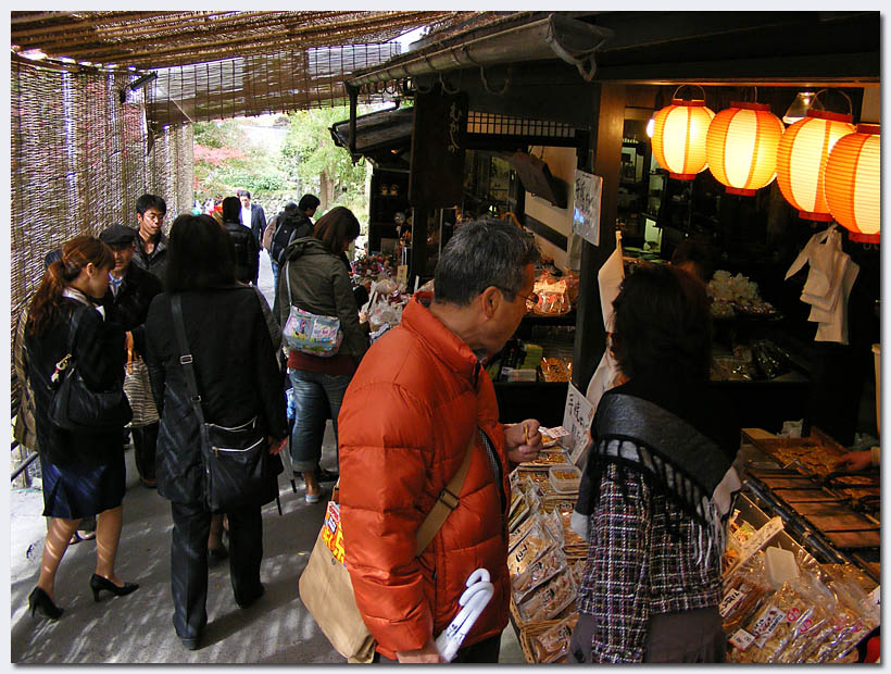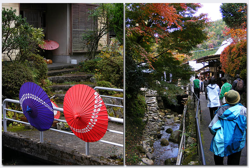 Am Kozan-ji gibt es auch eine Bushaltestelle des JR Busses, aber wenn man sowieso auf den nächsten Bus warten muss kann man besser die Straße entlang zur Bushaltestelle des Jingo-ji zurück laufen (etwa 10 min). Man kommt dann nämlich an dem Ausblick auf Takao vorbei (Bild 1) sowie an netten Restaurants, Teehäusern und Andenkenläden. Takao ist zurecht ein so beliebtes Ausflugsziel, die drei Tempel mit ihrer Herbstfärbung sind einfach ein Muss wenn man im Herbst in Kyoto ist. Zeitbedarf halber Tag.