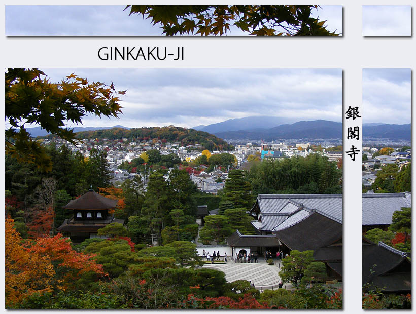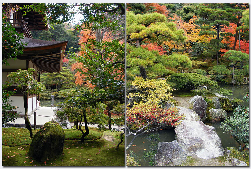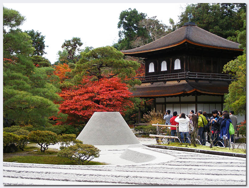 Gebaut im Jahr 1482 vom Shogun Ashikaga Yoshimasa in Anlehnung an den Goldenen Pavillon, den sein Großvater hatte errichten lassen. Das Untergeschoss ist im Shindenstil der Aristokratie erbaut, das Obergeschoss im Stil eines chinesischen Zen Tempels, ein perfektes kleines Gebäude. Im Vordergrund ragt aus dem „Meer des silbernen Sandes“ ein massiver Kieskegel heraus, der den Berg Fuji repräsentieren soll. Wie der Kegel jetzt so seine perfekte Form behält, nur aus Kies ist mir schleierhaft. Eine sehr schöne Gartenanlage mit Moosen und Teichen umgibt den Pavillon, angelegt nach dem Vorbild des Saiho-ji Moosgartens.