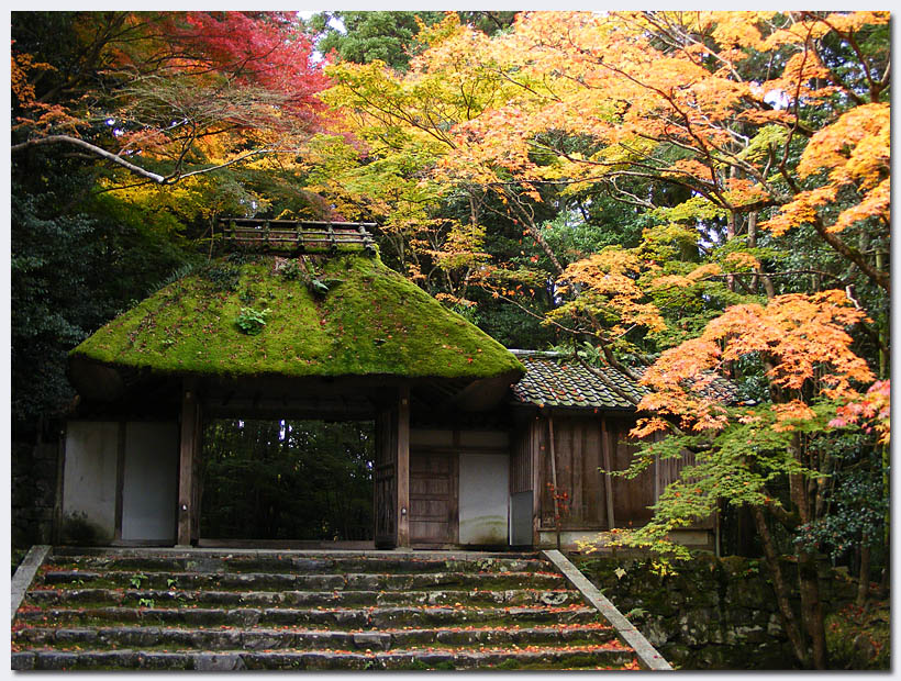 Wieder den Berg runter und etwas nach Norden, schon steht man vor dem Eingang des Gio-ji. Dieser Tempel liegt verwunschen mitten im Wald, Mooslandschaft, abgefallene Blätter, ein kleines
