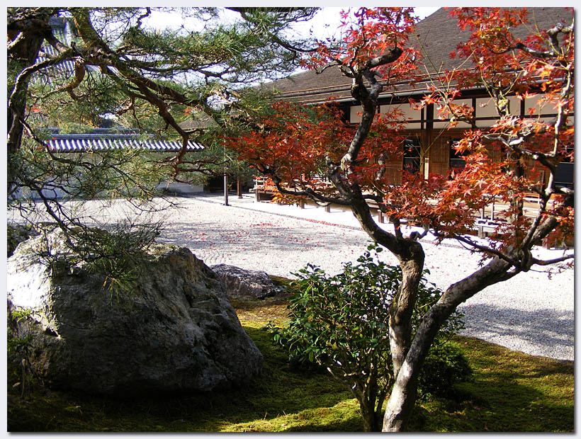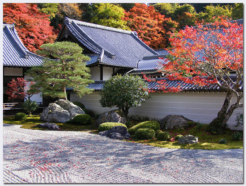 Auffälligstes Detail sind zwei große Kiesflächen, die mit herbstlichen Motiven verziert sind und jeden Morgen neu von den Mönchen angelegt werden.