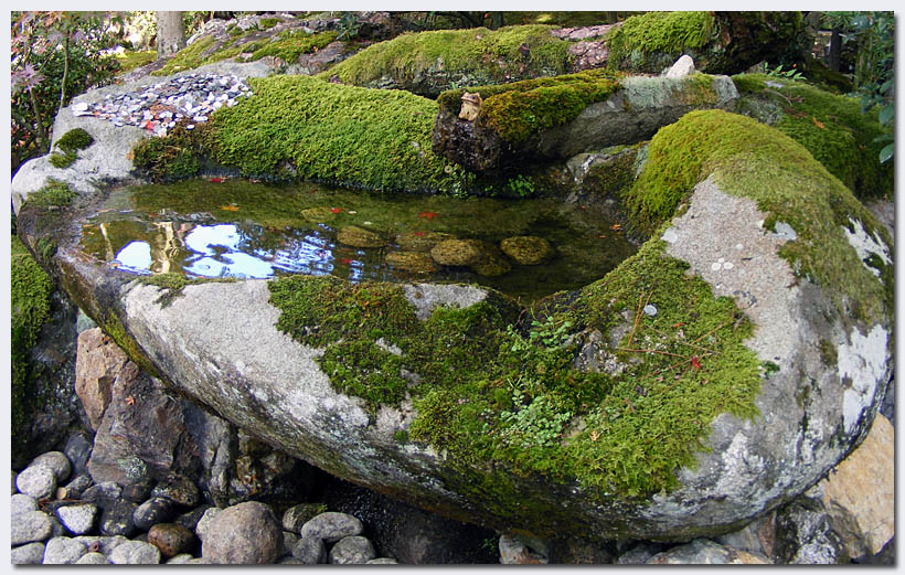Ganz anders der Untertempel Tenju-an, der war den Eintritt wieder mal wert. Interessante Gebäude und schöne Details wie die bemooste Quelle und schöne Kieslandschaften bestimmen den Garten.