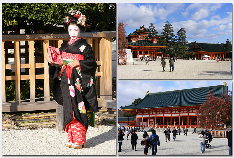 Etwas Zeit haben wir noch, etwa 20 min Fußweg von hier liegt noch ein großer Schrein, den können wir noch mitnehmen. Es ist der Heian Schrein, ein im Maßstab 5/8 verkleinerter Nachbau des ersten Kaiserpalastes aus dem Jahr 768. 1985 zur 1100 Jahrfeier der Stadt Heian-kyo (Kyoto) errichtet.