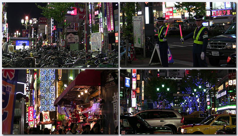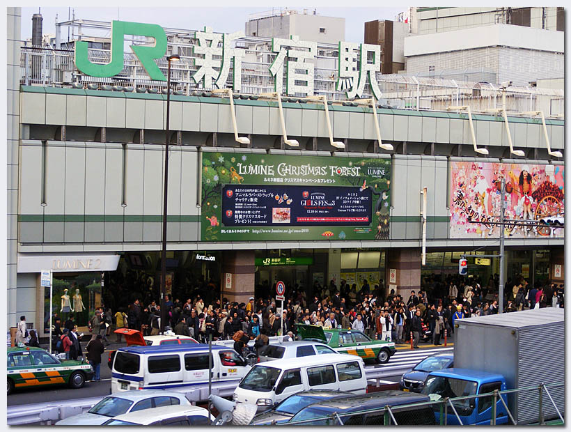 Shinjuku ist ein riesiger Einkaufs und Vergnügungsbezirk rund um die Shinjuku Station, am Wochenende platzt es hier aus allen Nähten. Die Shinjuku Station ist der meist frequentierteste Bahnhof der Welt, über 2 Millionen Menschen werden hier pro Tag durchgeschleust. Zur Rushhour treffen hier über 500 Personen pro Sekunde ein und verteilen sich auf die Ringbahnzüge und Ubahnen. Jetzt am Wochenende strömen die Massen aus den zahllosen Eingängen des Bahnhofes und bewegen sich in die Einkaufsstraßen.