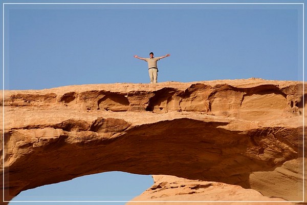 Als wir auf die Felsbrücke zurückblicken haben sich darin einige Beduinen mit wallenden Gewändern versammelt und winken uns zu.
