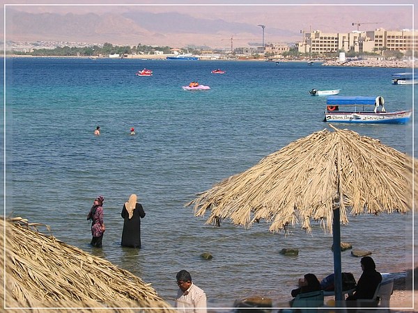 Mit einem Blick auf die in „voller Montur“ badenden Araberinnen verabschieden wir uns leichten Herzens vom Sightseeing in Jordaniens einziger Stadt mit Meerzugang.