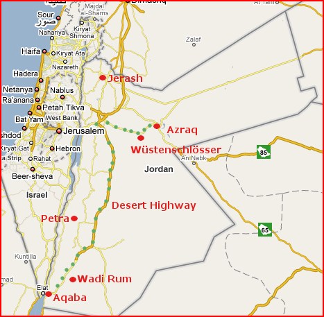 Von Aqaba (vorbei am Wadi Rum ) den Desert Highway nach Norden, kurz vor Amman nach Osten und zu den beiden Wüstenschlössern Qasr Kharana und Qasr Amra, Übernachtung in Azraq.