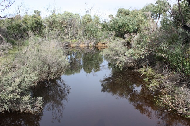 Nach einer Weile laufen kommen wir an die ersten Wasserlöcher, in denen Schnabeltiere leben sollen. Wir verhalten uns ganz leise und stellen uns mit Blick auf das Wasser angelehnt an das Holzgeländer hin. Mehr oder weniger regungslos verharren wir so fast 1,5 Stunden. Etliche Male erscheinen in regelmäßigen Abständen kleine Luftblasen an der Wasseroberfläche, aber leider taucht kein Tier dazu auf. Schade, aber Schnabeltiere sind nunmal sehr scheu.