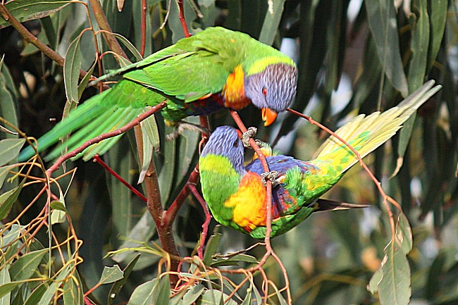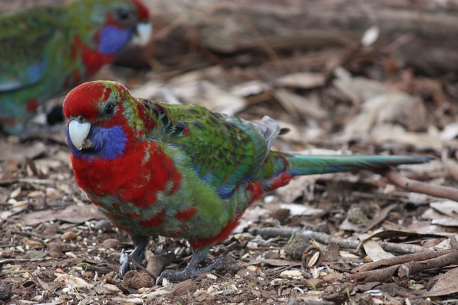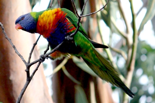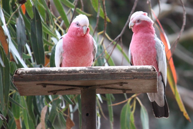 Neben den Kängurus haben sich hier zahlreiche Papageien und Sittiche niedergelassen. Immer wieder stehen von Vögeln bevölkerte Holzpodeste herum, auf denen die Tiere offensichtlich gefüttern werden. Ich entdecke Rosakakadus, Pennantsittiche und Regenbogen Loris, letztere sind leider äußerst fotoscheu und ein Einheimischer bestätigt in einem kleinen Smalltalk, dass ausgerechnet die Regenbogen Loris, die auch seiner Meinung nach die schönsten Papageien hier sind, leider die obersten Baumwipfel bevorzugen. Auch die übrigen Vögel sind dennoch schön anzusehen, insbesondere die bunt gescheckten jungen Pennantsittiche, die gerade vom grünen Jungtiergefieder ins rote Gefieder der Erwachsenen wechseln.