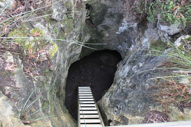 Unser nächster Haltepunkt sind die Kelly Hill Caves. Wir buchen die nächste Tour und spazieren bis dahin noch etwas durch den Wald. Dabei entdecken wir auch den früheren Eingang zu der Höhle. Das sieht schon mal vielversprechend aus.