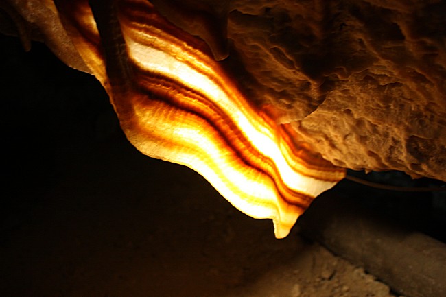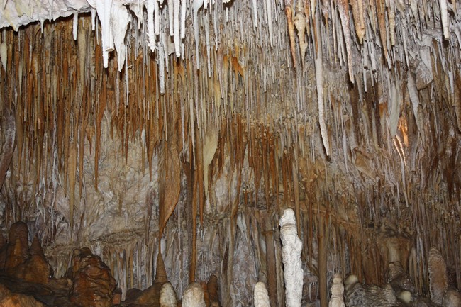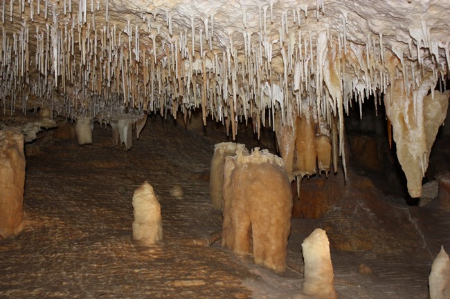 Mit einer Rangerin und einer kleinen Gruppe bestehend aus einer Familie mit drei Kindern, einem Pärchen und uns, steigen wir die steilen Stufen hinab in die Tropfsteinhöhle. Die Rangerin erklärt uns jede Menge und zeigt durch geziele Beleuchtung mit der Taschenlampe besonders schöne Stellen am Gestein. Auch das für die meisten Tropfsteinhöhlen obligatorische "Licht-ausmachen-und-Kerze-anmachen" ist in der Tour enthalten und wie immer beeindruckt es mich, wie sich die Gesteinsformationen im Kerzenschein verändern.
