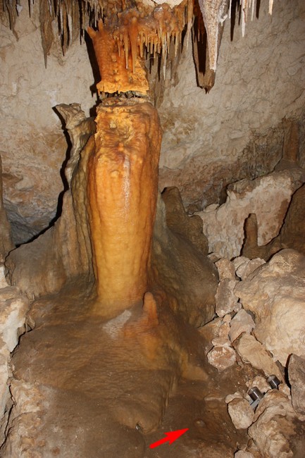 Ein 30 Jahre alter Stalagmit (roter Pfeil)