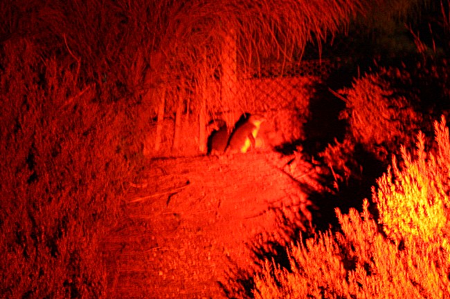 Nach dem Vortrag gehen wir in einer kleinen Gruppe zusammen mit einer Mitarbeiterin hinüber zur Küste in ein zur Straße hin eingezäuntes Grundstück. Der Zaun soll die Pinugine davon abhalten, auf die Straße zu laufen, denn in der Vergangenheit wurden wohl viele Tiere überfahren. Man hört ganz deutlich die Laute der Pinguine und es dauert nicht lang, bis wir mit Hilfe einer roten Taschenlampe einige Pinguine ausmachen. Einer watschelt direkt vor uns auf dem Weg entlang. Leider werden meine Fotos nicht wirklich scharf, aber blitzen darf man nicht, da das natürlich die Pinugine stört.