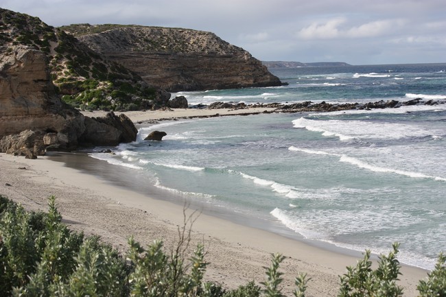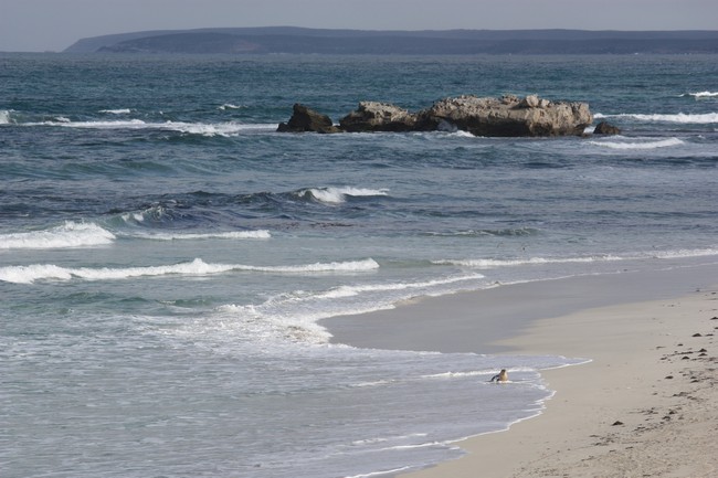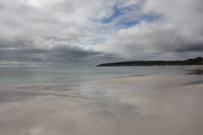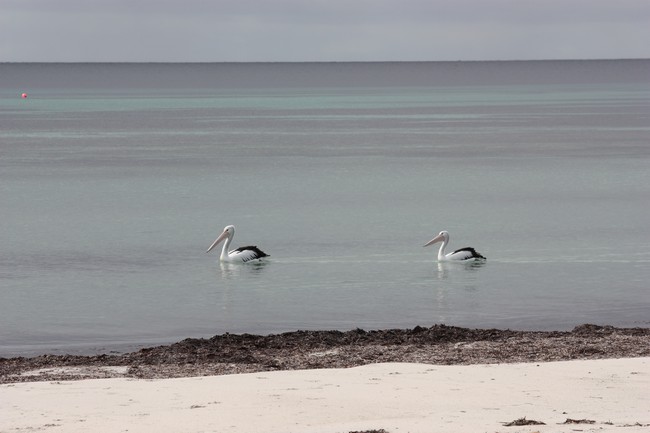 Wir fahren also wieder zurück in Richtung Penneshaw, biegen allerdings vorher links ab zu unserem nächsten Ziel, der Emu Bay. Hier soll es einen schönen einsamen Strand geben und wir werden nicht enttäuscht. Wir unternehmen einen ausgiebigen Strandspaziergang und treffen auf dem ganzen Weg nur einen einzigen Einheimischen mit Auto und Hund. Der Strand ist unglaublich schön, hell und flachabfallend, einer der schönsten, die ich je gesehen habe. Die vorbeischwimmenden Pelikane sind die Krönung. Leider spielt das Wetter nicht mehr so ganz mit und es bewölkt sich. Bei Sonne wäre es bestimmt noch schöner.