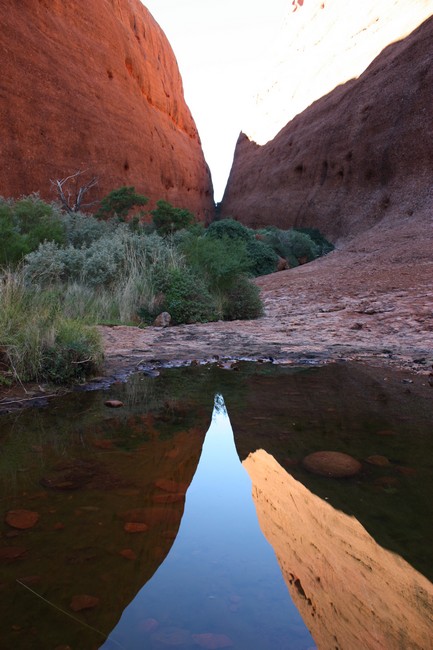 Da es noch früh am Tag ist, beschließen wir, auch noch den 2,6 Kilometer langen Walpa Gorge Walk zu laufen. Auch dieser führt zwischen zwei Felsen entlang. An manchen Stellen haben sich vom Regenwasser kleine Wasserlöcher gebildet. Links und rechts vom Weg gehen steile Felswände hinauf. Ich kann kaum schätzen, wie hoch die Wände sind