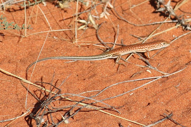 Als wir uns so langsam wieder dem Ausgangspunkt nähern, halte ich zunehmend nach Wellensittichen Ausschau, denn wie ich im Forum gelesen hatte, gibt es hier eine kleine Wasserstelle, die wohl auch von Wellensittichen genutzt wird. Ich entdecke unzählbar viele Zebrafinken, die ich bisher nur aus Zoohandlungen kannte, und eine weitere Vogelart mit gelbem Kopf, aber leider weit und breit keine Wellensittiche, obwohl wir wirklich lange an der fast ausgetrockneten Wasserstelle rasten. Schade...