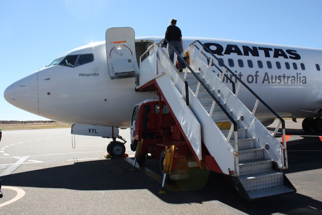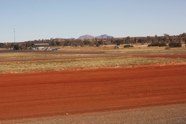 Der Flughafen ist äußerst klein und übersichtlich. Nach einer Weile warten ist unser Flugzeug bereit und es kann losgehen Richtung Sydney. Ein Gate mit Durchgang zum Flugzeug gibt es nicht; man muss noch in guter alter Manier selbst über das Rollfeld zum Flugzeug laufen. Wir fliegen wieder mit einer Boeing 737-800 von Qantas. Als wir zur Startbahn rollen, erhaschen wir noch einen letzten Blick über die Olgas.
