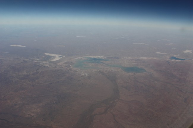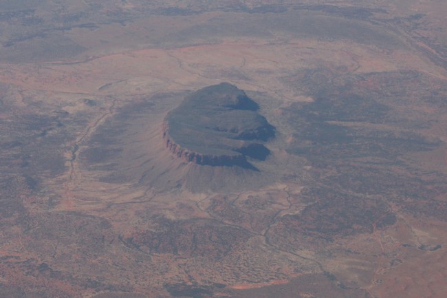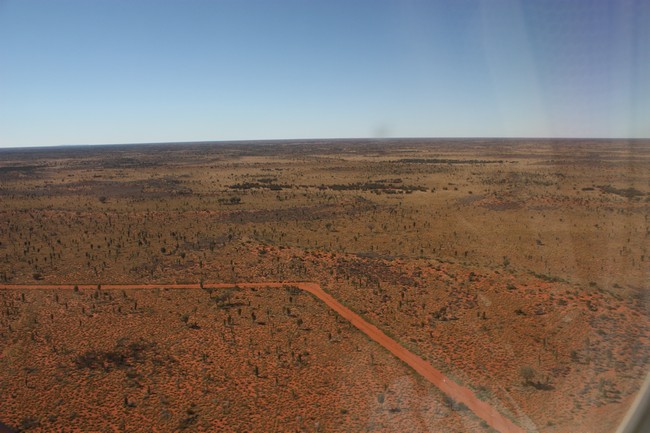 Leider sitzen wir auf der falschen Seite im Flugzeug, um einen Blick auf den Ayers Rock zu haben, wir sehen lediglich das weite Outback. Nach einer Weile Flug erscheint dafür auf unserer Seite der Mount Conner, auch interessant, diesen von oben zu sehen.
