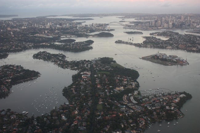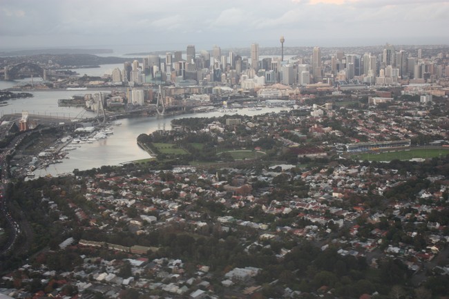 Der Flug geht schnell herum. Es setzt schon eine leichte Abenddämmerung ein, als wir Sydney erreichen. Dennoch ergattern wir noch schöne Blicke auf die Stadt. Ich sehe sogar schon vom Flugzeug aus den Sydney Tower, die Harbour Bridge und die Oper. Ich wusste gar nicht, dass die Stadt aus so vielen kleinen Inseln und Halbinseln besteht. Es gefällt mir schon jetzt richtig gut.